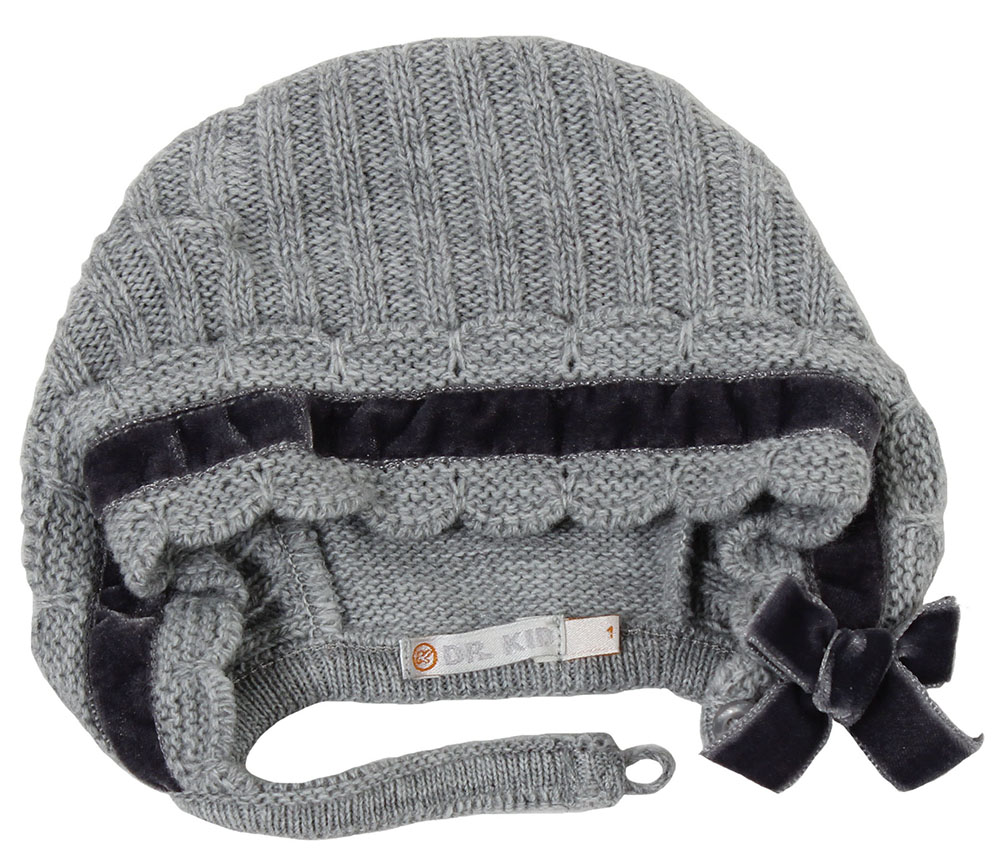 Touca para menina com fita de veludo e laço. Aperta de lado com um botão