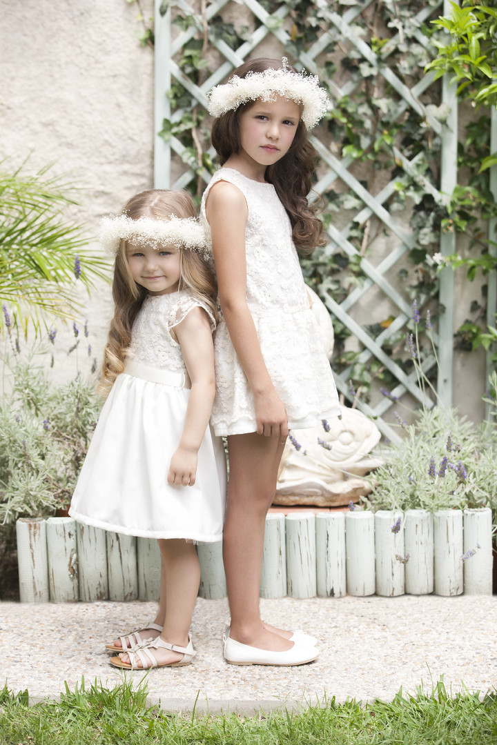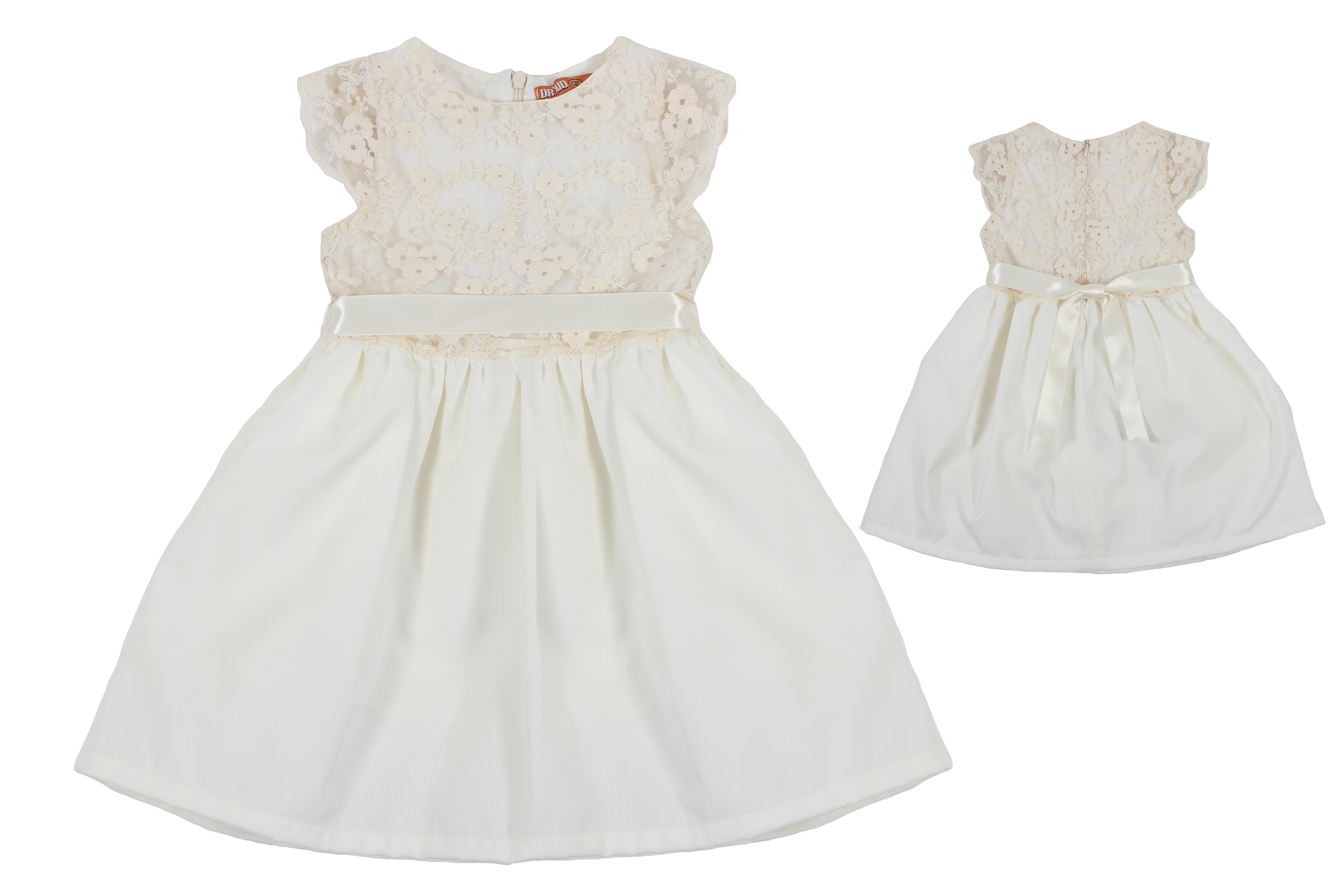 Vestido manda curta para menina. Parte de cima com renda e saia em tecido. Laço de cetim na cintura a apertar atrás.